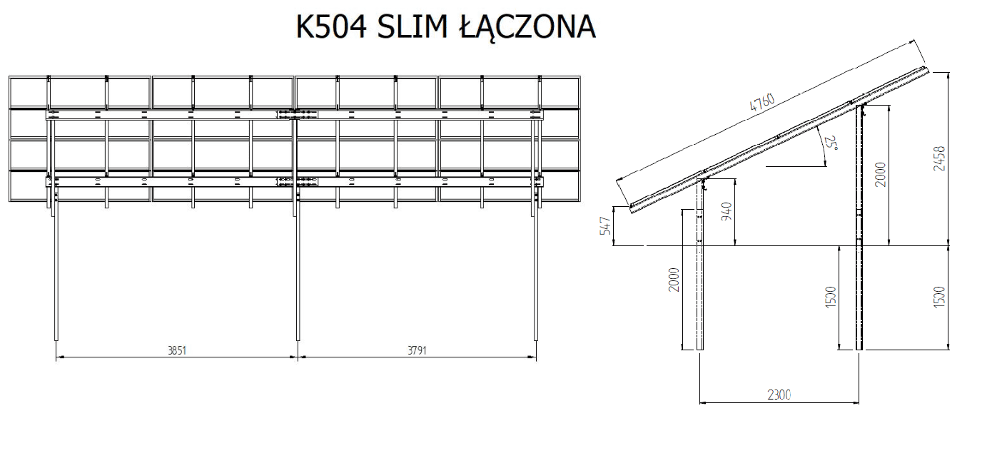 K504 SLIM ŁĄCZONA jest konstrukcją zaprojektowaną z myślą o wielkopowierzchniowych elektrowniach słonecznych, dzięki jej modułowości możliwe jest dokładanie elementów w zależności od terenu.